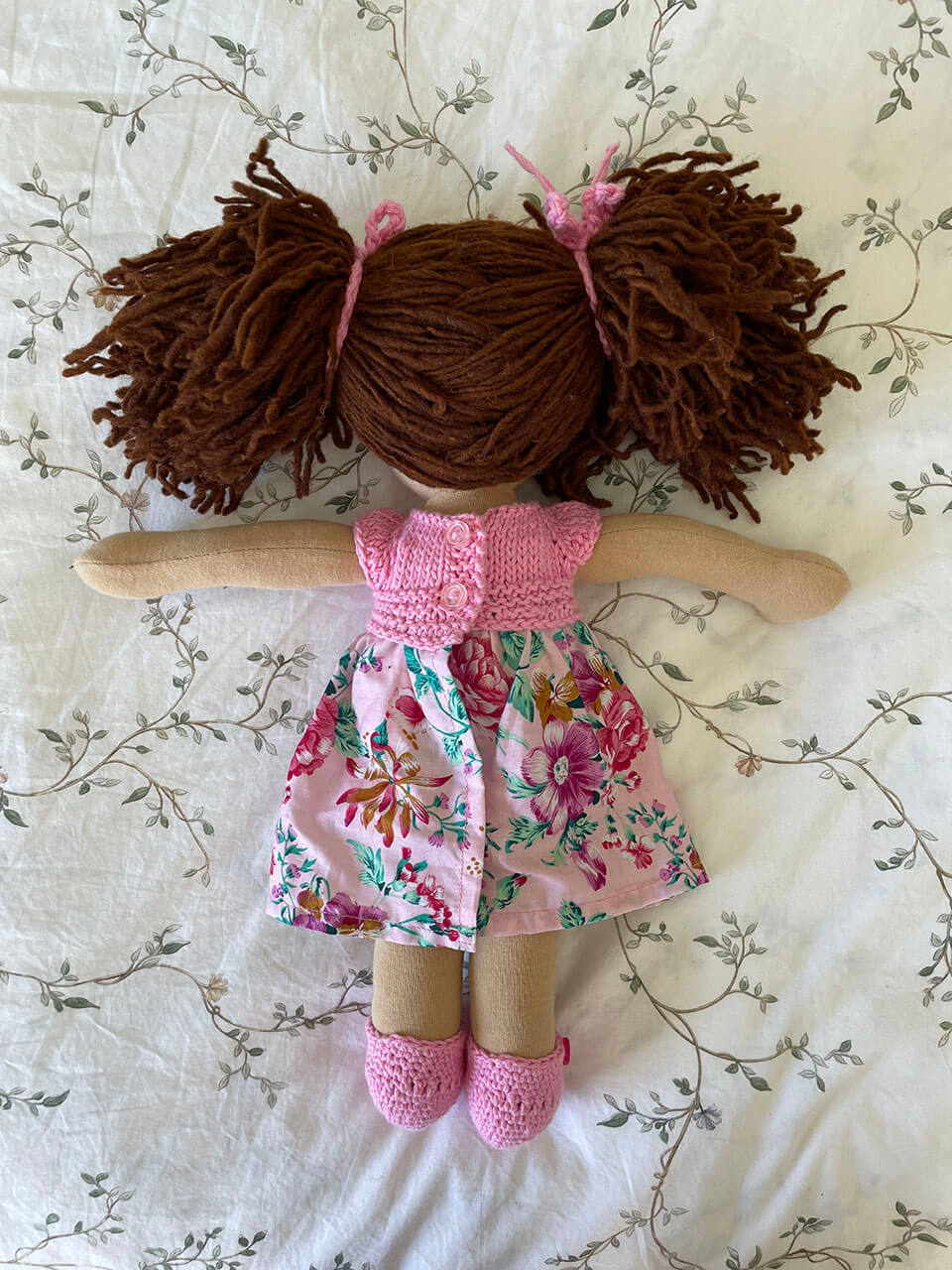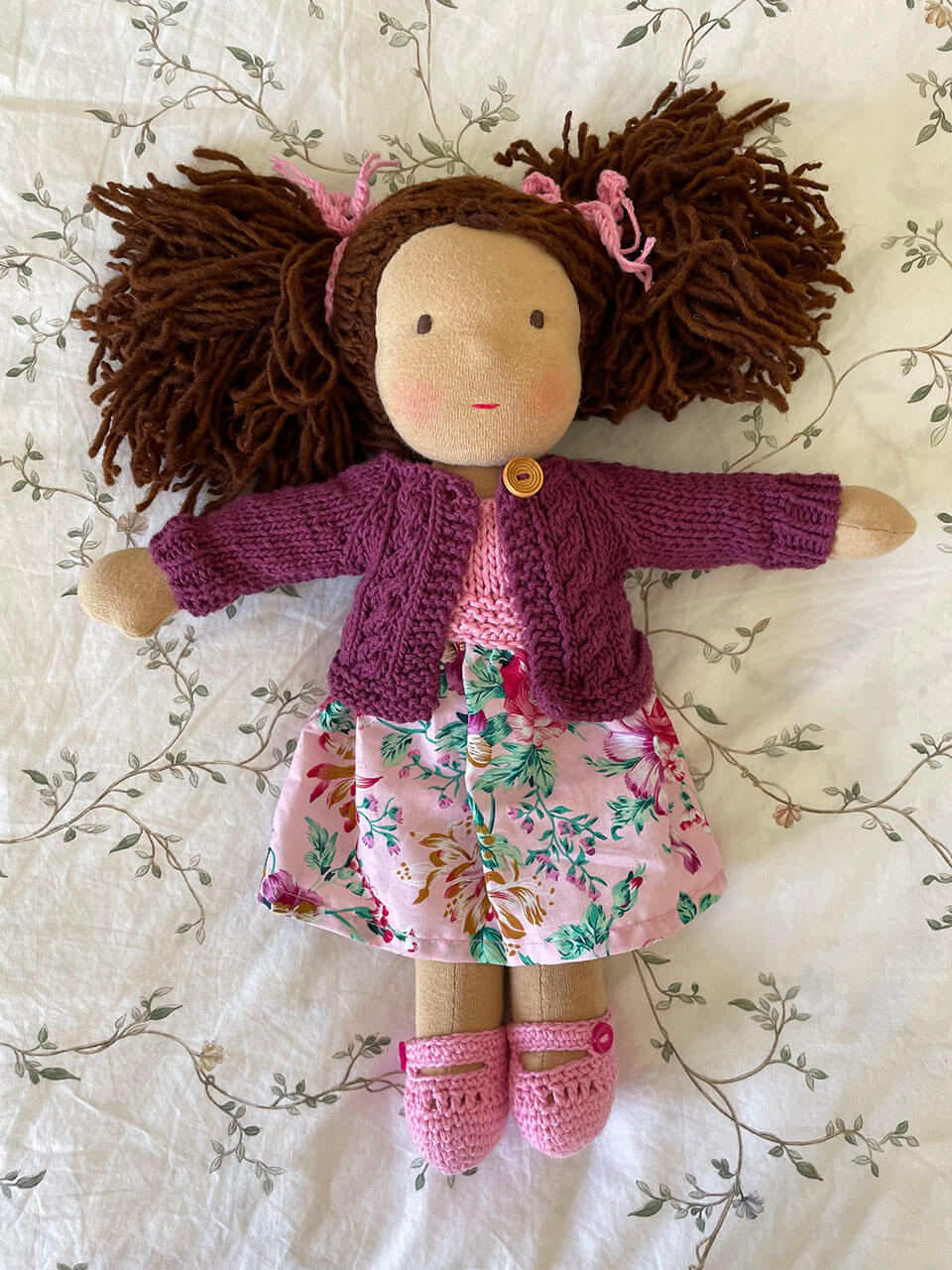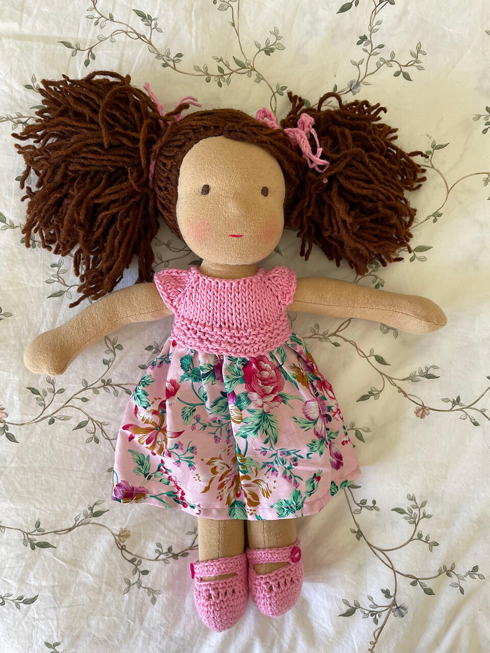 Muñeca con pelo color café claro y vestido tejido color rosa y tela de flores