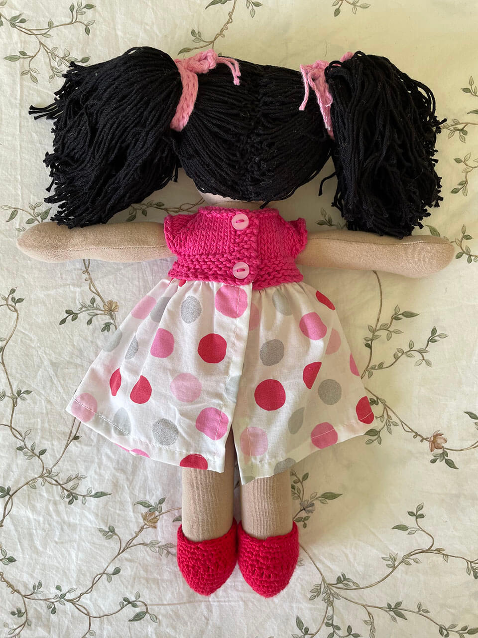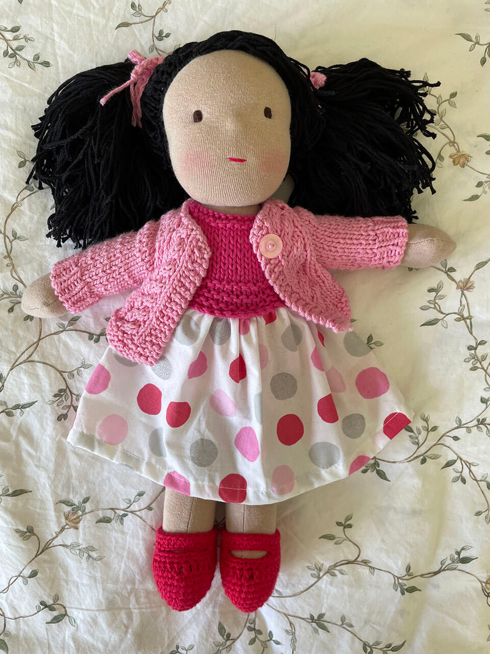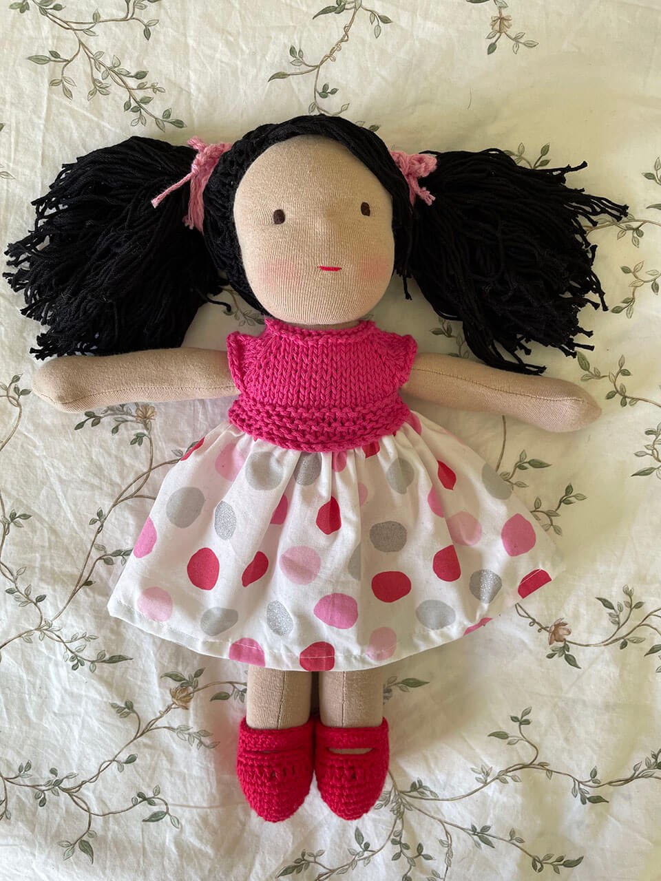 Muñeca con pelo de estambre de algodón color negro con vestido tejido color rosa fuerte con tela de puntos