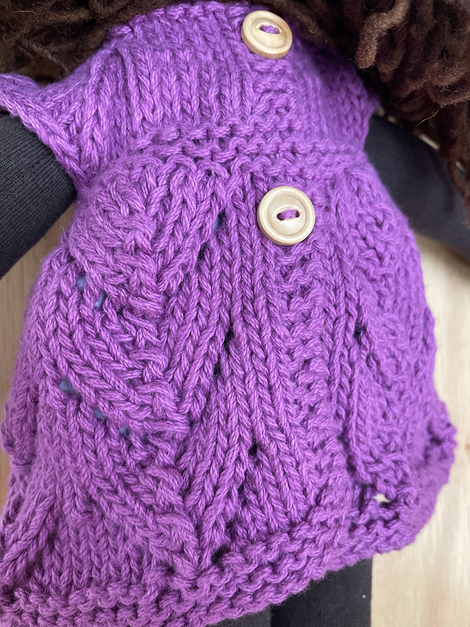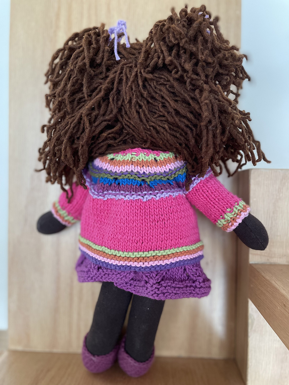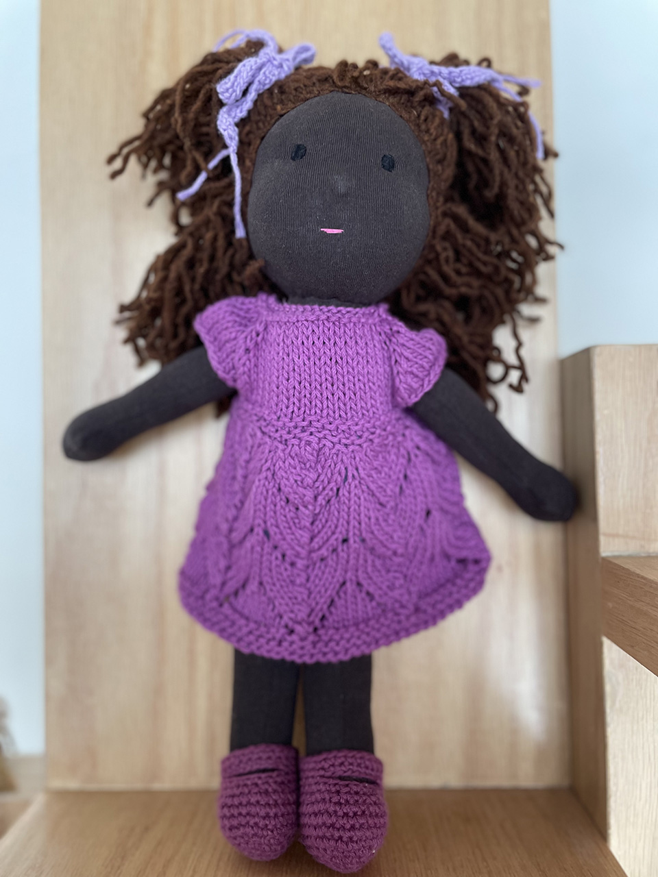 Muñeca morena con pelo obscuro, y vestido de color uva